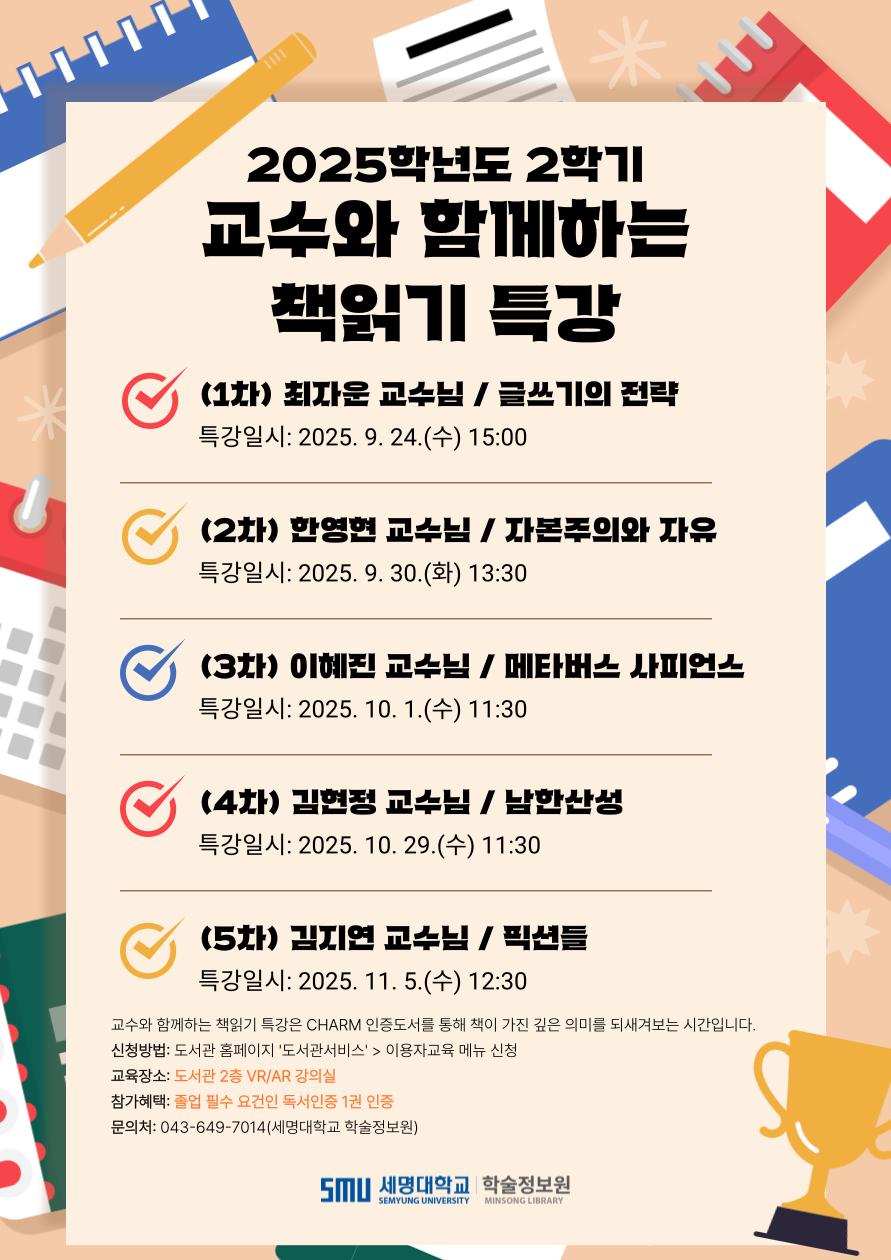 본문 시작 홈으로 커뮤니티 학과안내 교수소개 학과과정 커뮤니티 홈페이지가이드 공지사항 공지사항 취업정보 학과사진첩 학과행사 동아리 학생회 교우소식 공지사항 페이스북 트위터 프린트 2025학년도 2학기 교수와 함께하는 책읽기 특강 법학과 조회 : 13 등록일 : 2025-10-24 목록 이전堤川-仁川机场市外大巴路线运行 简介 다음 第九届 社会科学大学讨论大会召开简介 담당부서 : 법학과 담당자 : 안덕홍 연락처 : 043-649-1764 최종수정일 : 2024-10-26 만족도조사 만족도 조사 이 페이지에서 제공하는 정보에 대하여 만족하시나요? 매우만족 만족 보통 불만족 매우불만족