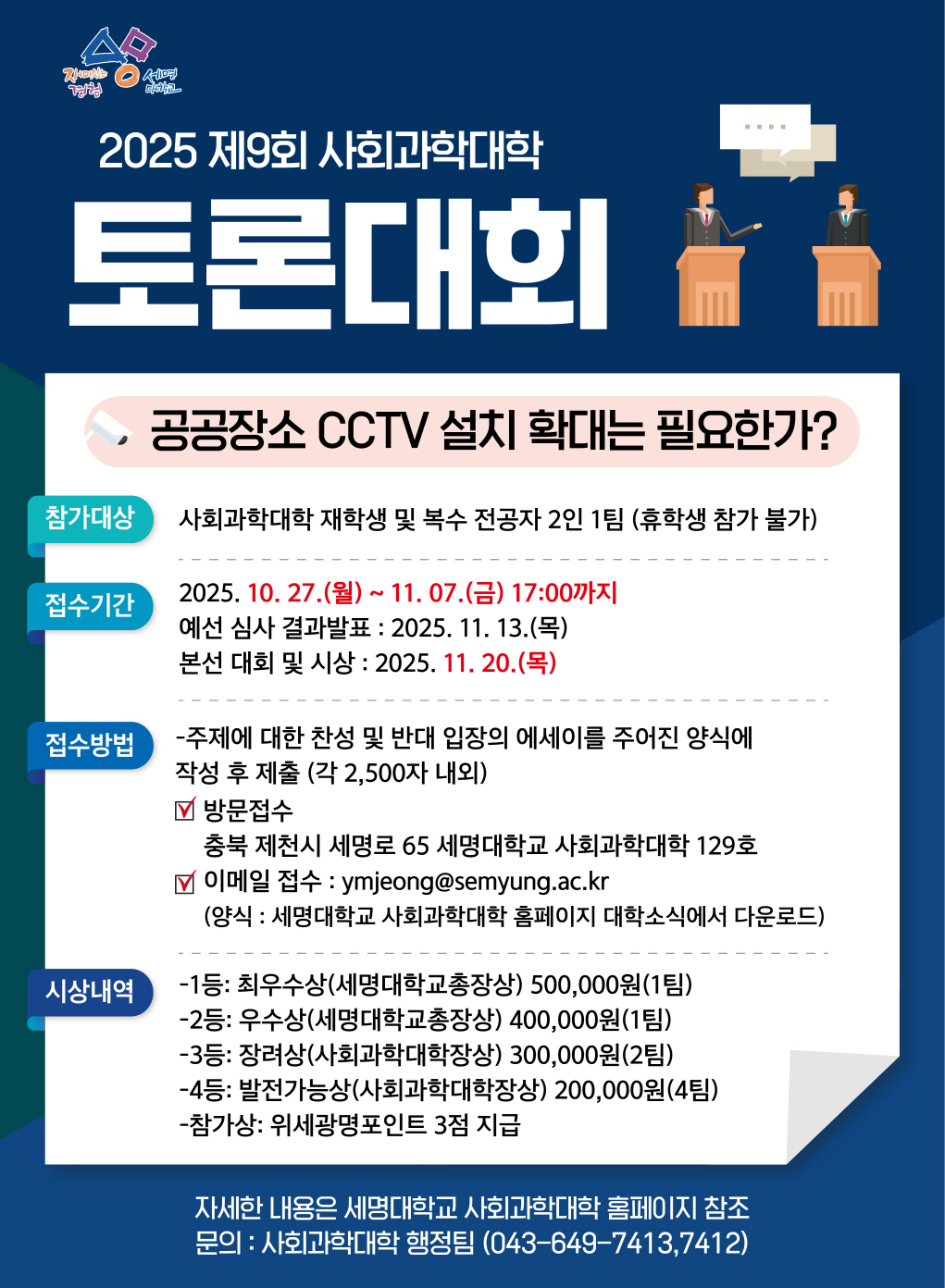 사회과학대학에서는 시사, 경제 등 사회현안에 관심을 갖고 사회과학도로서의 소양을 갖춘 ‘매력적인 두뇌’를 찾기 위해 제9회 사회과학대학 토론대회를 개최합니다.