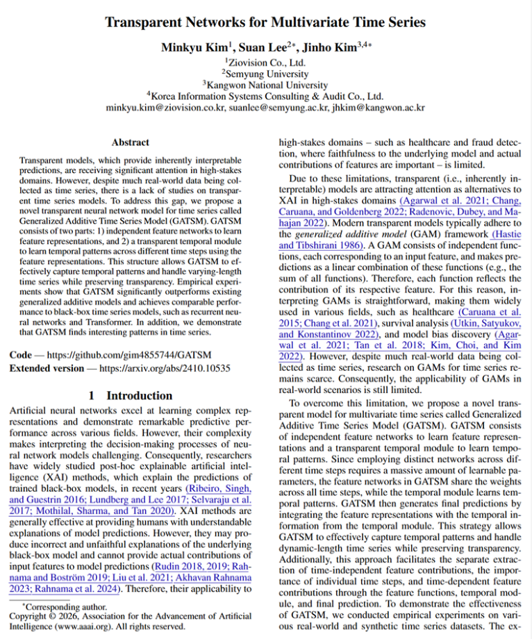 이번에 채택된 논문은 **「Transparent Networks for Multivariate Time Series(다변량 시계열을 위한 투명한 네트워크)」**로, 인공지능 분야의 대표적인 한계로 지적되어 온 ‘블랙박스(Black-box)’ 문제를 해결하기 위한 새로운 투명 신경망 모델 **GATSM(Generalized Additive Time Series Model)**을 제안했다는 점에서 높은 평가를 받았다.