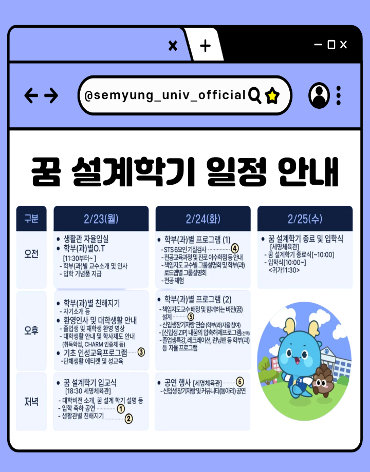 본문 시작 홈으로 학부활동 학부소개 학부활동 교육과정 커뮤니티 학부생활 입학안내 홈페이지가이드 학부갤러리 학부행사 학생회 활동 전공 동아리 학부갤러리 학부갤러리 페이스북 트위터 프린트 2026학년도 신입생 '꿈 설계학기오리엔테이션' 시행 안내 컴퓨터학부 470 2026-02-13 🌸 세명대학교 신입생 여러분, 환영합니다! 🌸 ✨2026학년도 신입생을 위한 꿈 설계학기 안내✨ -일정 : 2026.02.23(월) ~ 02.25(수) -대상 : 2026학년도 신입생 ✔ 졸업인증제 필수 인성교육 4시간 인정 ✔ 참가비 전액 학교 지원 목록 이전세명대학교 데이터지능연구실, 국제학술대회 'IEEE BigComp 2026'서 우수논문상(Runner-Up) 수상 다음 새해 복 많이 받으세요 담당부서 : 컴퓨터학부 담당자 : - 연락처 : 043-649-1272 최종수정일 : 2024-10-26 만족도조사 만족도 조사 이 페이지에서 제공하는 정보에 대하여 만족하시나요? 매우만족 만족 보통 불만족 매우불만족