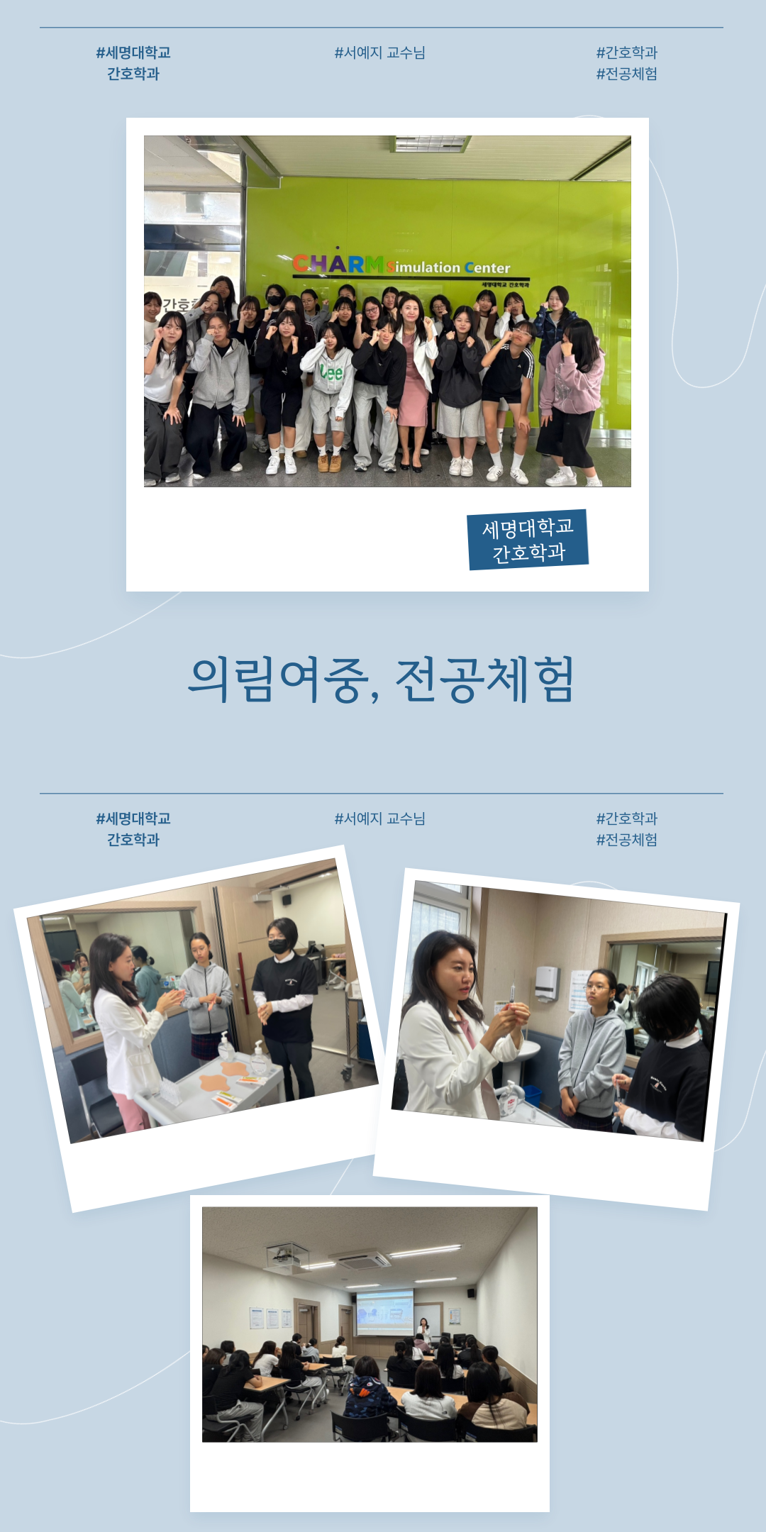 본문 시작 홈으로 학과소식 학과소개 교수소개 교육과정 학과소식 학과특성화 사업 커뮤니티 홈페이지가이드 학과소식 학과소식 우리학과 졸업생은 지금 해외병원인턴십 학과소식 페이스북 트위터 프린트 💉의림여중 전공체험💉 간호학과 조회 : 226 등록일 : 2025-09-30 서예지 학과장님과 함께한 의림여중 간호학과 전공체험 간호학과에 관심 있는 학생들에게 뜻깊은 시간이 되길 바랍니다! ✨ 목록 이전2025년 2학기 간호학과 교학간담회 다음 간호학과 청룡체전 준우승🎉 만족도조사 만족도 조사 이 페이지에서 제공하는 정보에 대하여 만족하시나요? 매우만족 만족 보통 불만족 매우불만족