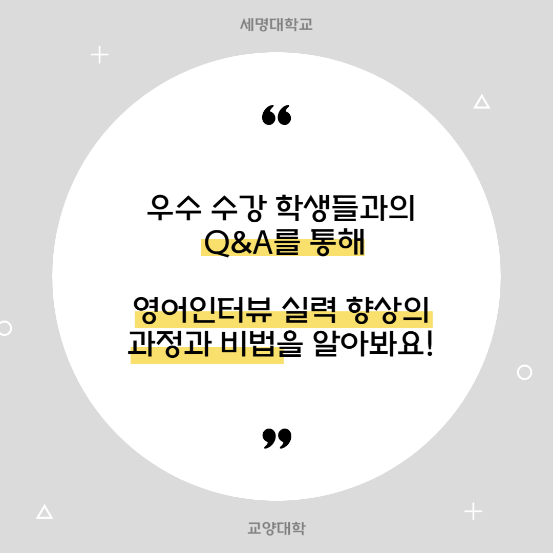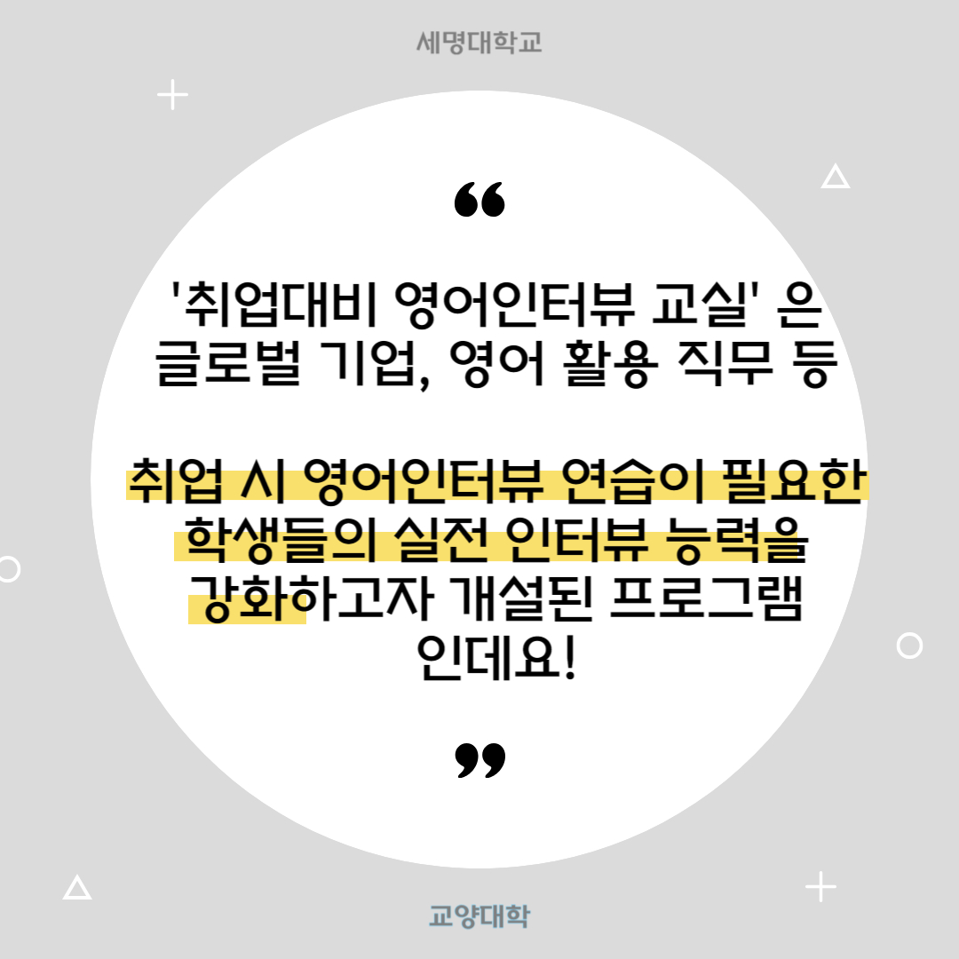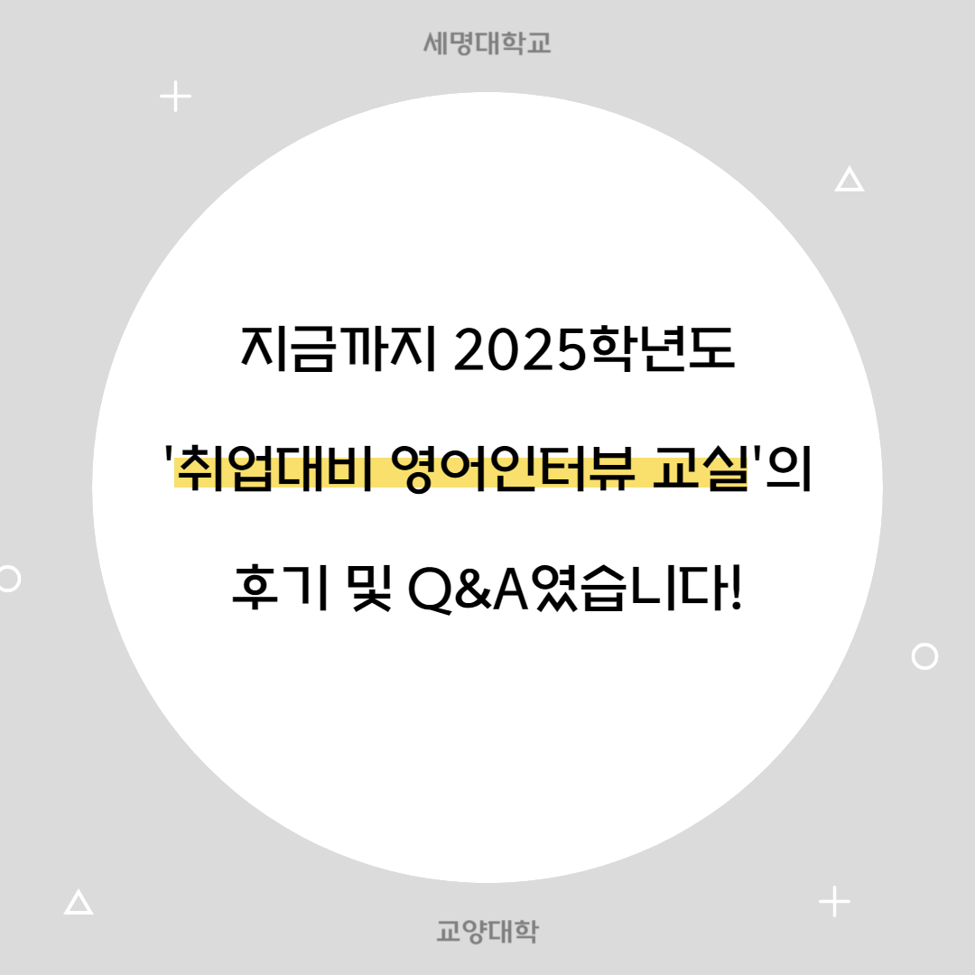 본문 시작 홈으로 커뮤니티 게시판 대학소개 교수소개 교양교육과정 교양교육 프로그램 커뮤니티 게시판 입학안내 홈페이지가이드 공지사항 공지사항 자료실 학생 커뮤니티 취업정보 공지사항 페이스북 트위터 프린트 2025학년도 "취업대비 영어인터뷰 교실" 후기 및 Q&A 교양대학 조회 : 12 등록일 : 2025-11-04 목록 이전2025학년도 "취업대비 영어인터뷰 교실" 영어 자기소개서 모음집 담당부서 : 교양대학 담당자 : - 연락처 : 043-649-7065 최종수정일 : 2024-10-26 만족도조사 만족도 조사 이 페이지에서 제공하는 정보에 대하여 만족하시나요? 매우만족 만족 보통 불만족 매우불만족
