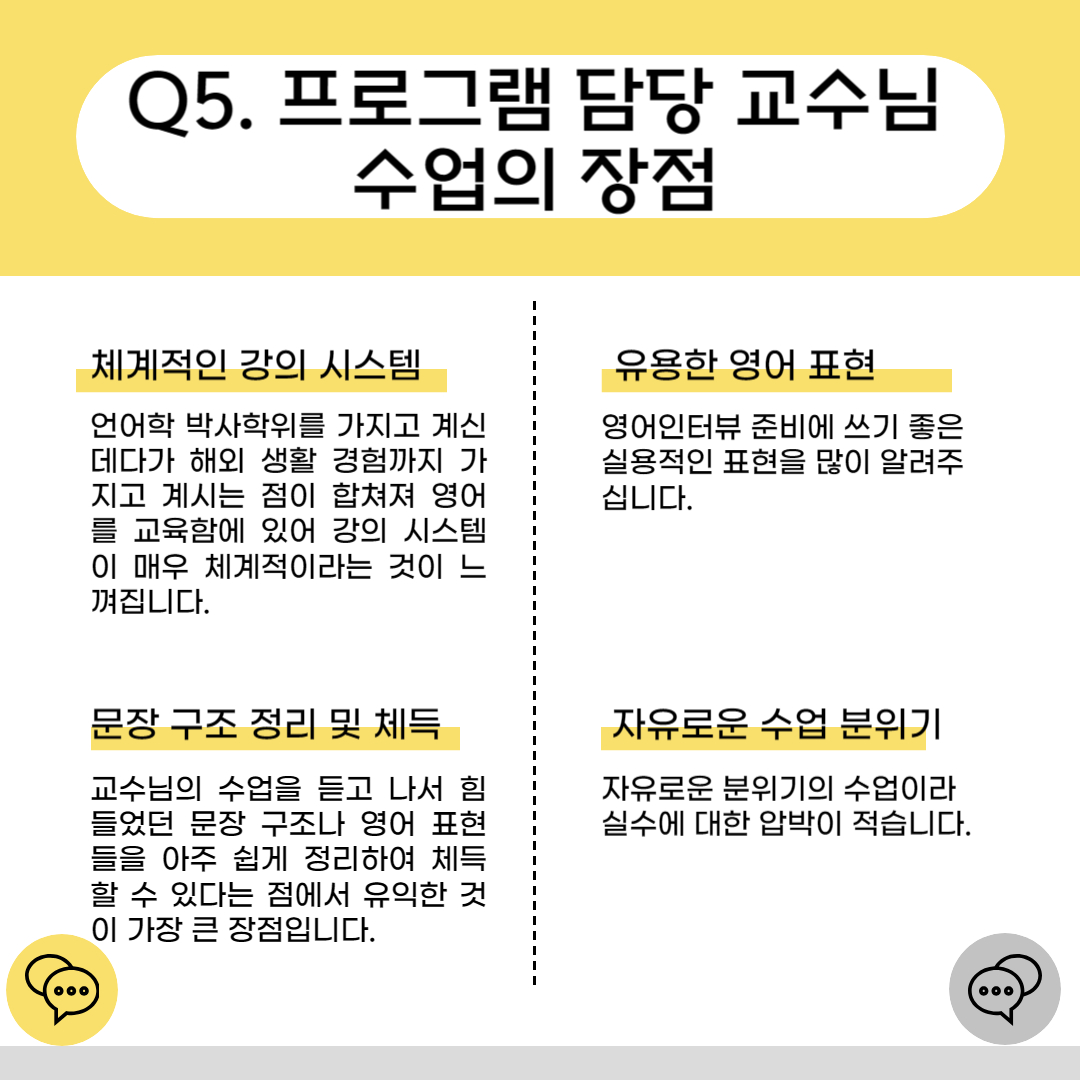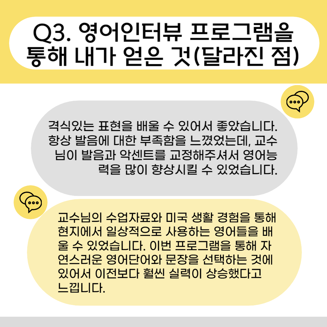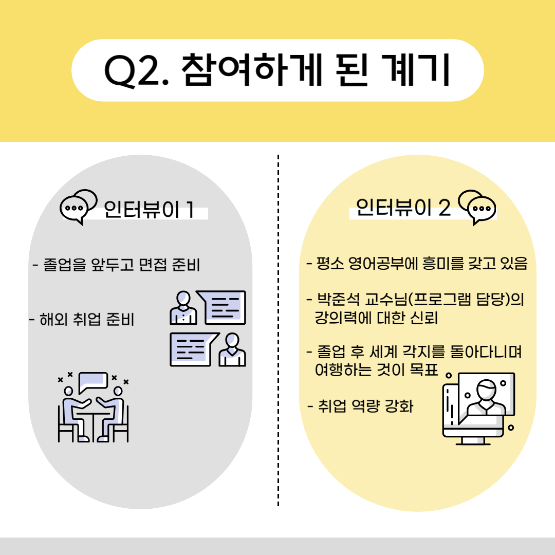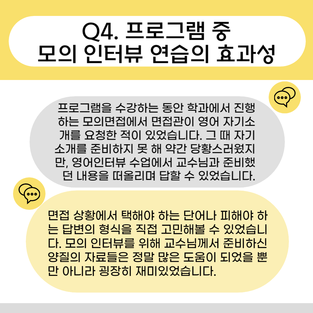 본문 시작 홈으로 커뮤니티 게시판 대학소개 교수소개 교양교육과정 교양교육 프로그램 커뮤니티 게시판 입학안내 홈페이지가이드 공지사항 공지사항 자료실 학생 커뮤니티 취업정보 공지사항 페이스북 트위터 프린트 2025학년도 "취업대비 영어인터뷰 교실" 후기 및 Q&A 교양대학 조회 : 12 등록일 : 2025-11-04 목록 이전2025학년도 "취업대비 영어인터뷰 교실" 영어 자기소개서 모음집 담당부서 : 교양대학 담당자 : - 연락처 : 043-649-7065 최종수정일 : 2024-10-26 만족도조사 만족도 조사 이 페이지에서 제공하는 정보에 대하여 만족하시나요? 매우만족 만족 보통 불만족 매우불만족
