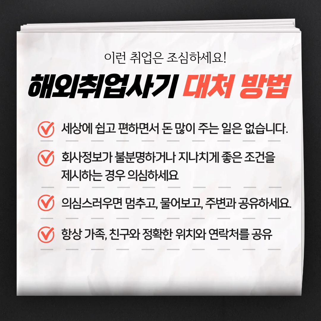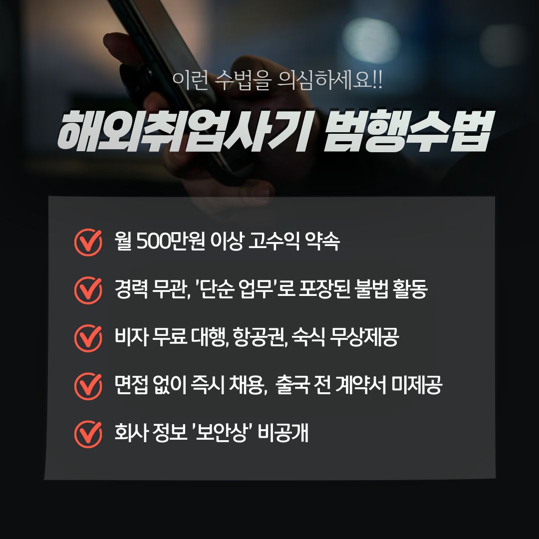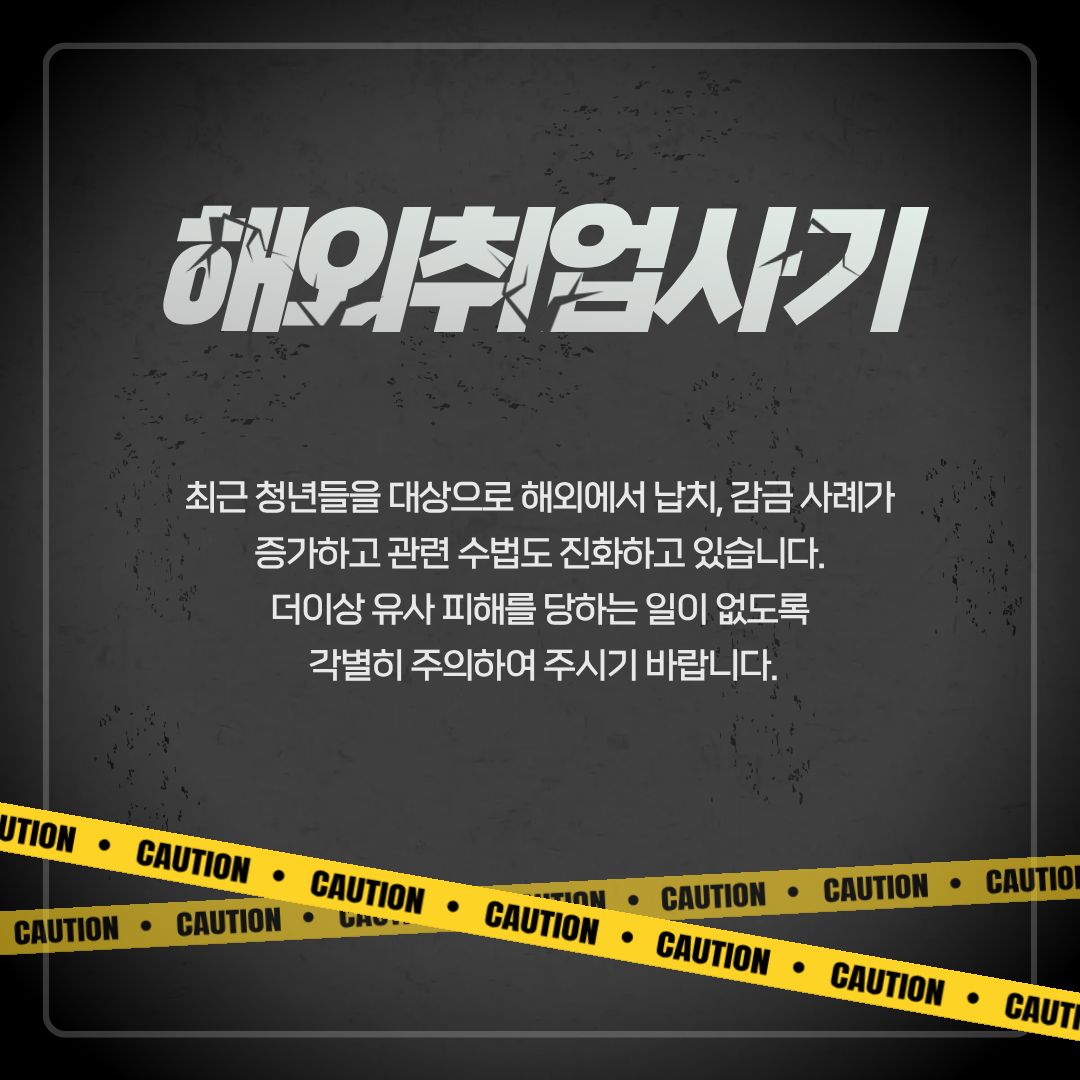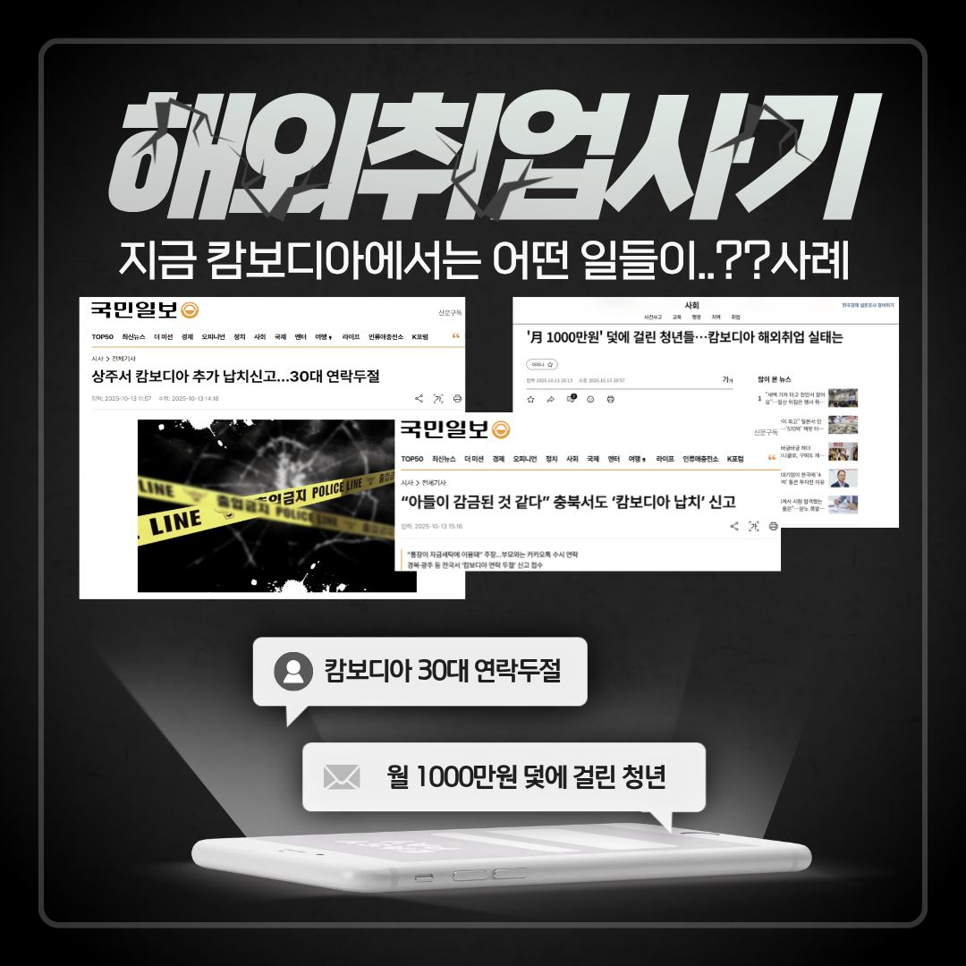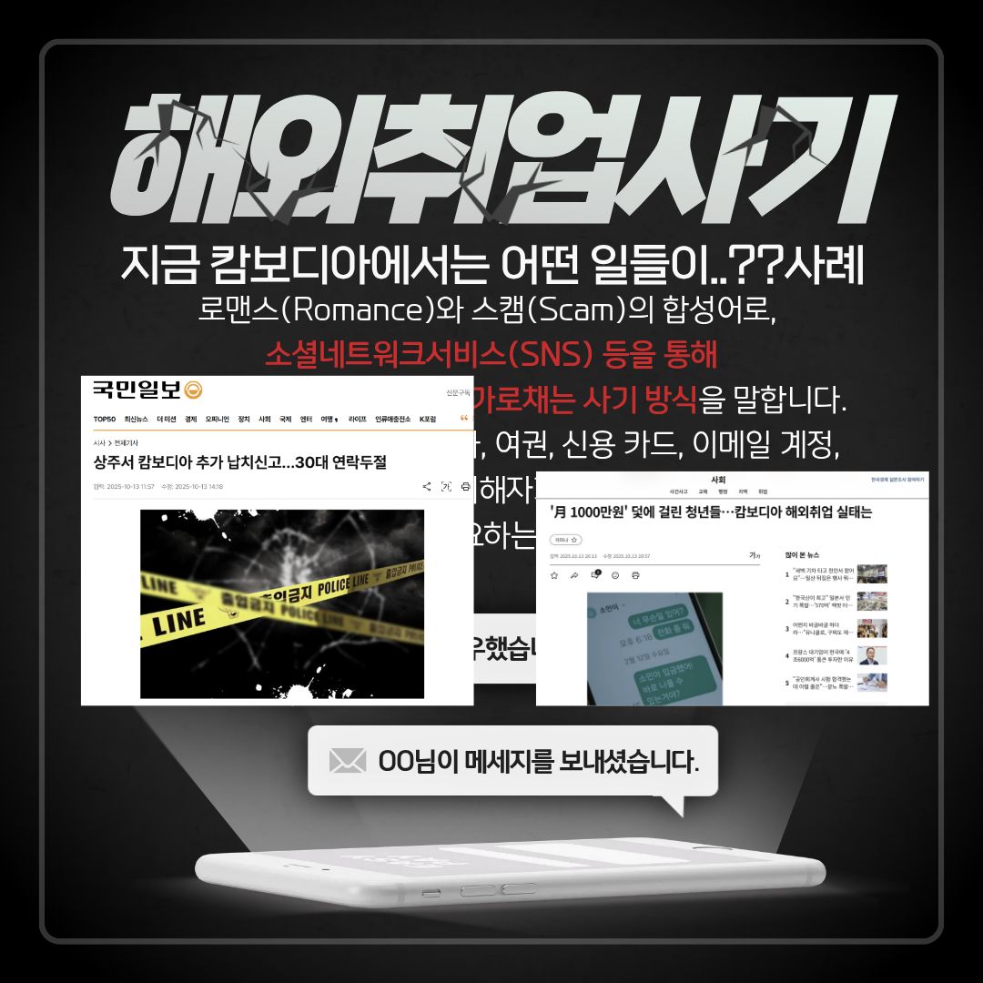 본문 시작 홈으로 커뮤니티 학과소개 교수소개 학과과정 커뮤니티 홈페이지가이드 학부공지 학부공지 학과일정 포토갤러리 학생회 동아리 학부공지 페이스북 트위터 프린트 캄보디아 방문 및 체류 주의 안내 경찰학과 조회 : 5 등록일 : 2025-10-20 캄보디아 방문 및 체류 주의 안내 최근 캄보디아 내에서 우리 국민을 대상으로 한 범죄 및 유인 피해 사례가 발생하고 있습니다. 캄보디아를 여행하거나 체류 중인 분들은 불법 취업 제안, 고수익 알바, SNS 유인 등에 각별이 주의 하시기 바랍니다. 목록 이전중간고사 간식 이벤트 다음 경찰학과 수시면접 만족도조사 만족도 조사 이 페이지에서 제공하는 정보에 대하여 만족하시나요? 매우만족 만족 보통 불만족 매우불만족