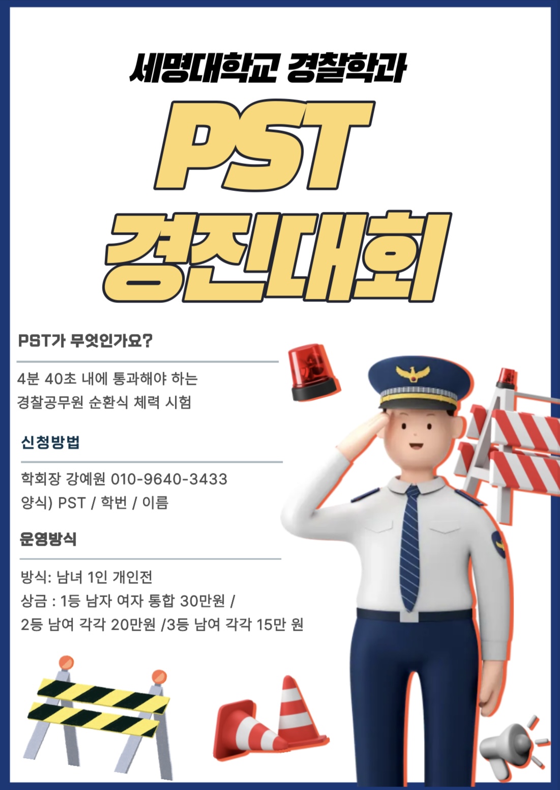안녕하십니까, 경찰학과 23대 학생회 '개화'입니다. 11월 5일 수요일, 경찰학과 학술제가 진행됩니다 ! 학술제는 내년부터 바뀔 경찰 체력시험 PST와 사건현장을 재구성하여 단서를 찾아 사건을 해결하는 방탈출 형식으로 진행됩니다. 참가비는 따로 없으며 상금은 위 포스터를 참고해주시기 바랍니다. ☑️ PST는 16시 30분부터 진행되며, ⭐️1위는 남녀 혼합 순위, 2위와 3위는 남녀 따로 따로 순위가 진행됨으로 많은 참여 부탁드립니다. ☑️ 학술의 밤은 19시부터 진행되고, 참가인원은 1팀당 3~4명으로 구성 가능하며, 선착순으로 신청받습니다. ☑️ 신청 방법은 010-9640-3433 으로 대표자 한분이 본인 포함 모든 팀원의 신청종목/ 이름/ 학번 / 전화번호를 보내주시기 바랍니다. 예시) pst / 강예원 / 2022195000 / 01096403433 학술의 밤 / 팀원 이름 / 팀원 학번 / 팀원 전화번호