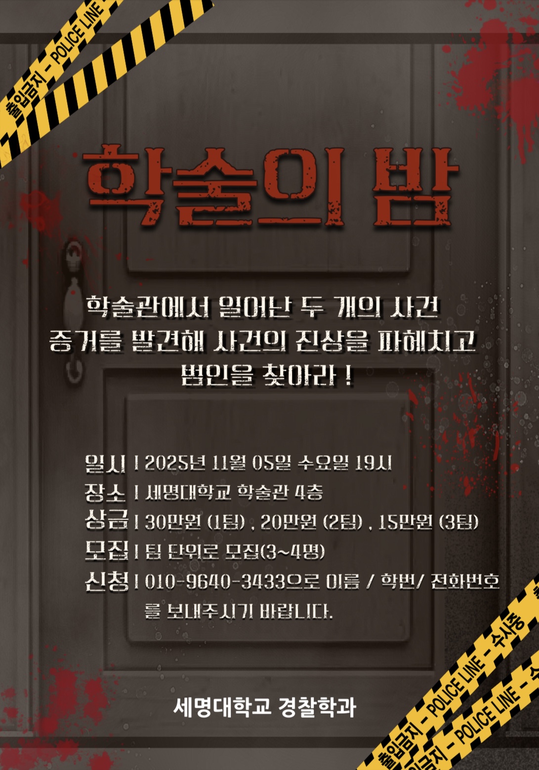 안녕하십니까, 경찰학과 23대 학생회 '개화'입니다. 11월 5일 수요일, 경찰학과 학술제가 진행됩니다 ! 학술제는 내년부터 바뀔 경찰 체력시험 PST와 사건현장을 재구성하여 단서를 찾아 사건을 해결하는 방탈출 형식으로 진행됩니다. 참가비는 따로 없으며 상금은 위 포스터를 참고해주시기 바랍니다. ☑️ PST는 16시 30분부터 진행되며, ⭐️1위는 남녀 혼합 순위, 2위와 3위는 남녀 따로 따로 순위가 진행됨으로 많은 참여 부탁드립니다. ☑️ 학술의 밤은 19시부터 진행되고, 참가인원은 1팀당 3~4명으로 구성 가능하며, 선착순으로 신청받습니다. ☑️ 신청 방법은 010-9640-3433 으로 대표자 한분이 본인 포함 모든 팀원의 신청종목/ 이름/ 학번 / 전화번호를 보내주시기 바랍니다. 예시) pst / 강예원 / 2022195000 / 01096403433 학술의 밤 / 팀원 이름 / 팀원 학번 / 팀원 전화번호