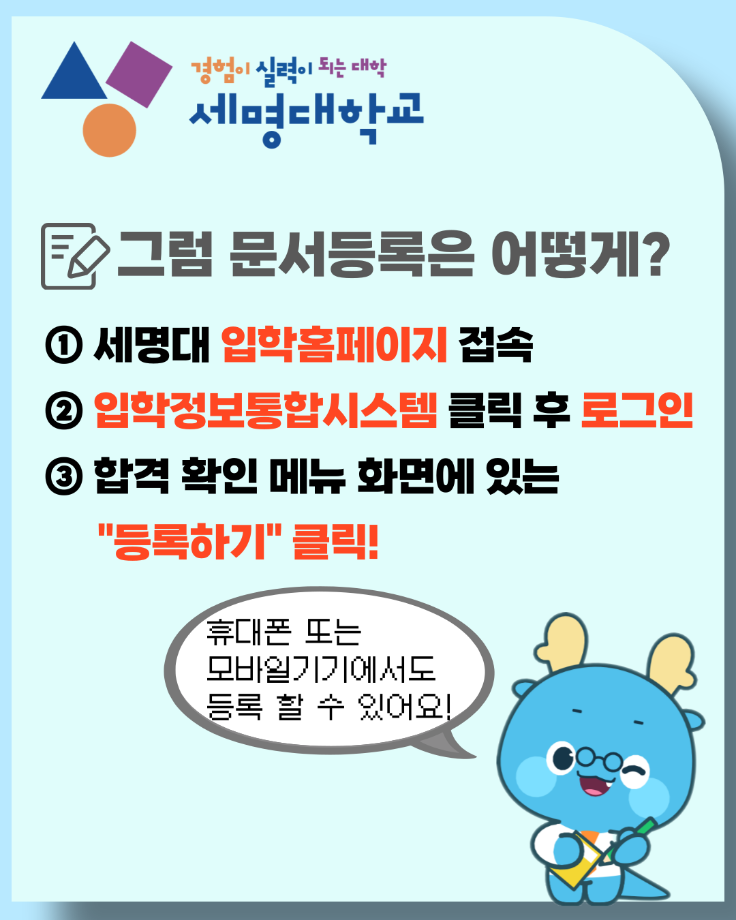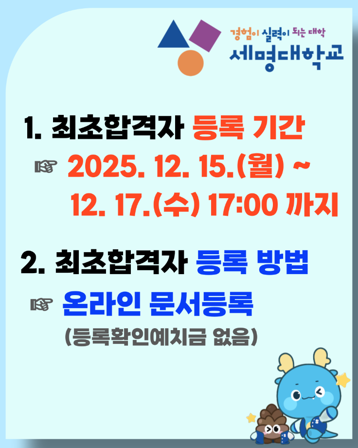 본문 시작 홈으로 학과생활 학과소개 교수소개 교과과정 학과생활 홈페이지가이드 사진게시판 공지사항 사진게시판 전공자료실 동아리 학과행사 사진게시판 페이스북 트위터 프린트 [수시모집] 2026학년도 수시모집 최초합격자 등록안내 산업디자인학과 136 2025-12-15 목록 이전[설경] 세명대학교 설경 다음 [수시모집] 2026학년도 수시모집 충원합격자 발표안내 담당부서 : 산업디자인학과 담당자 : - 연락처 : 043-649-1436 최종수정일 : 2024-10-26 만족도조사 만족도 조사 이 페이지에서 제공하는 정보에 대하여 만족하시나요? 매우만족 만족 보통 불만족 매우불만족