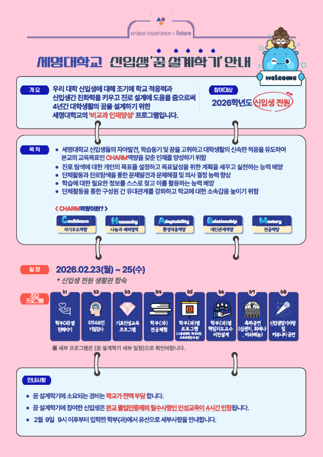 본문 시작 홈으로 학과생활 학과소개 교수소개 교과과정 학과생활 홈페이지가이드 사진게시판 공지사항 사진게시판 전공자료실 동아리 학과행사 사진게시판 페이스북 트위터 프린트 [학생처] 2026학년도 신입생 '꿈 설계학기(오리엔테이션)' 시행 산업디자인학과 12 2026-02-04 목록 이전다이소 세명대점 오픈(2/19) 안내 담당부서 : 산업디자인학과 담당자 : - 연락처 : 043-649-1436 최종수정일 : 2024-10-26 만족도조사 만족도 조사 이 페이지에서 제공하는 정보에 대하여 만족하시나요? 매우만족 만족 보통 불만족 매우불만족