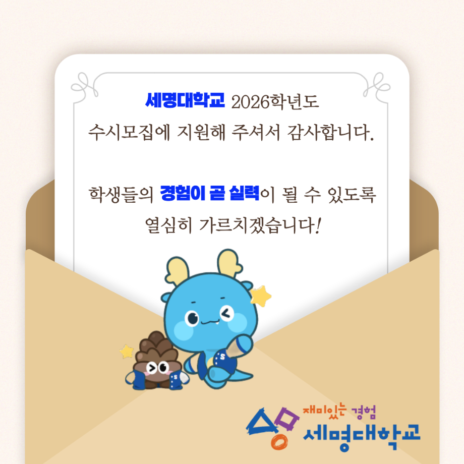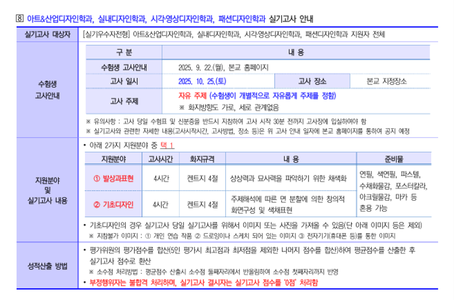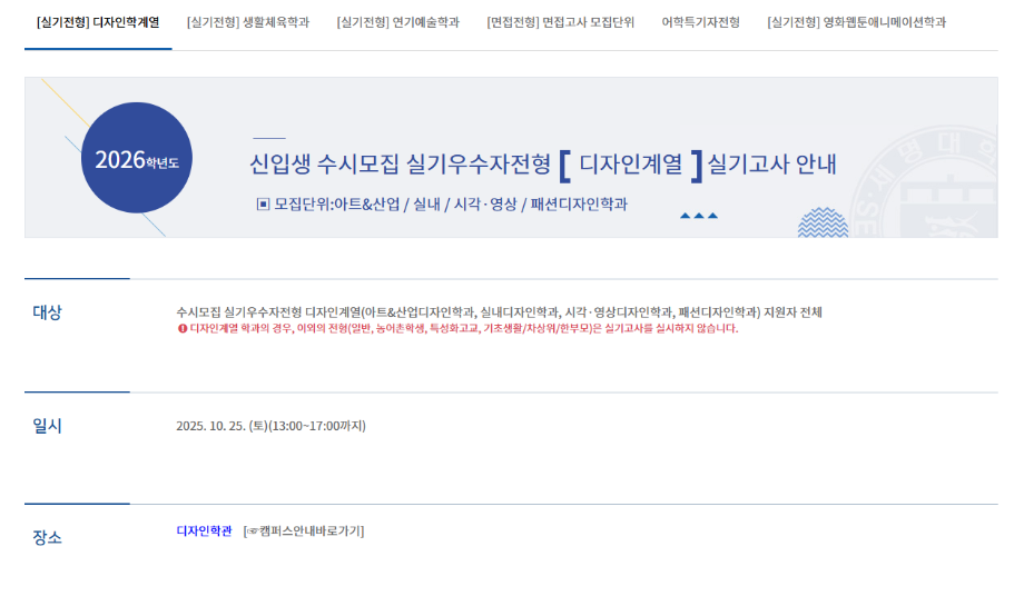 본문 시작 홈으로 입학/AI 학과소개 학과과정 시영소식 입학/AI 학과자랑 SNS소통 홈페이지가이드 입학여기 입학여기 디자인 정보 AI 콘텐츠 연구소(AI 디자인) 입학여기 페이스북 트위터 프린트 2026 수시모집 디자인계열학과 실기고사 안내 - 시각영상디자인학과 시각영상디자인학과 160 2025-10-01 2026 수시모집 디자인계열학과 실기고사 안내- 시각영상디자인학과 실기고사 안내 바로가기 > https://www.semyung.ac.kr/ipsi/sub01_07_03.do 목록 이전8월 12일 -중고등학생 대상 취업 특강- AI 브랜딩 만족도조사 만족도 조사 이 페이지에서 제공하는 정보에 대하여 만족하시나요? 매우만족 만족 보통 불만족 매우불만족