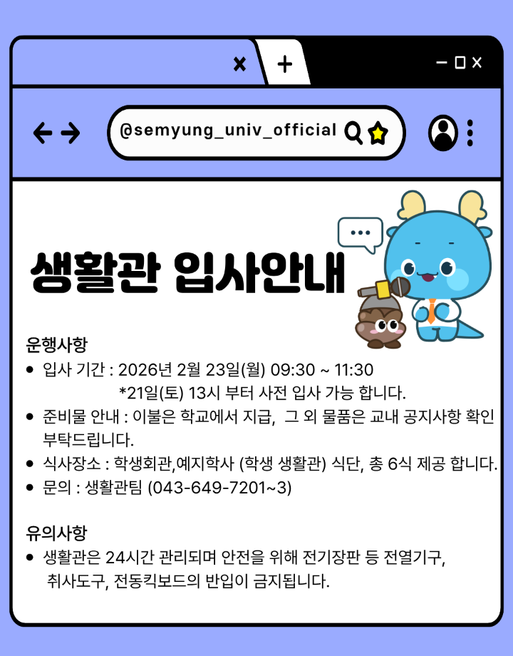 본문 시작 홈으로 커뮤니티 학과소개 교수소개 교육과정 학과 행사 및 활동 커뮤니티 홈페이지가이드 열린정보 학과일정 학과공지 채용정보 및 자료 열린정보 포토갤러리 먹거리, 즐길거리 포토갤러리 사진 사진 영상 사진 페이스북 트위터 프린트 사진 영상 2026학년도 신입생 '꿈 설계학기(오리엔테이션)' 시행 건축학과 258 2026-02-13 https://www.semyung.ac.kr/prog/vwBoard/bbs01/kor/sub08_02_01/view.do?board_num=188873&mno=sub08_02_01&pageIndex=1&searchCondition=&searchKeyword= 목록 이전2026학년도 정시모집 및 편입학 최초합격자 발표 다음 새해 복 많이 받으세요. 만족도조사 만족도 조사 이 페이지에서 제공하는 정보에 대하여 만족하시나요? 매우만족 만족 보통 불만족 매우불만족